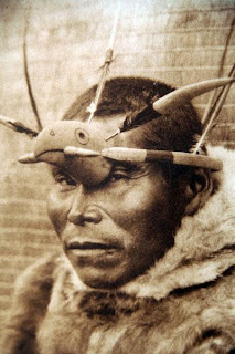 An Edward Curtis photograph from 1928, showing an Inuit hunter/fisherman wearing a bird mask.