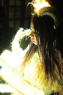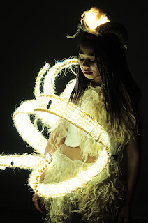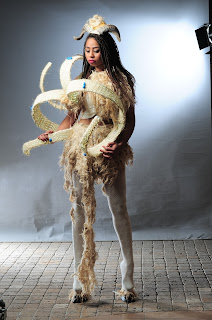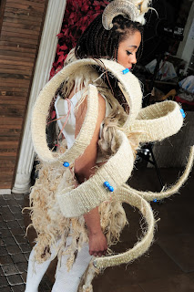 Demir Boynuz 1,5 metre alınan 3 adet demir ikiye katlanarak oval bir demir üzerine sarılıp boynuz şekli verildi.Boynuz şekli verilen demirler kare demir üzerine kaynak yaptırıldı.Daha sonra bu demirlerin üzerine ledler döşendi ve ledlerin üzeri çift taraflı bantla kaplanarak,etrafı kendir ipi ile sarıldı.Belirli kısmına mavi boncuk kendir ipi ile bağlandı.Demir boynuzu büstiyer kısmına dikmek için kare demirde açılan deliklerin altına kumaş yerleştirildi daha sonra bu kumaş büstiyer'in üstüne